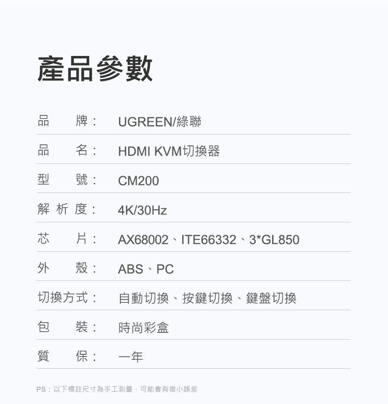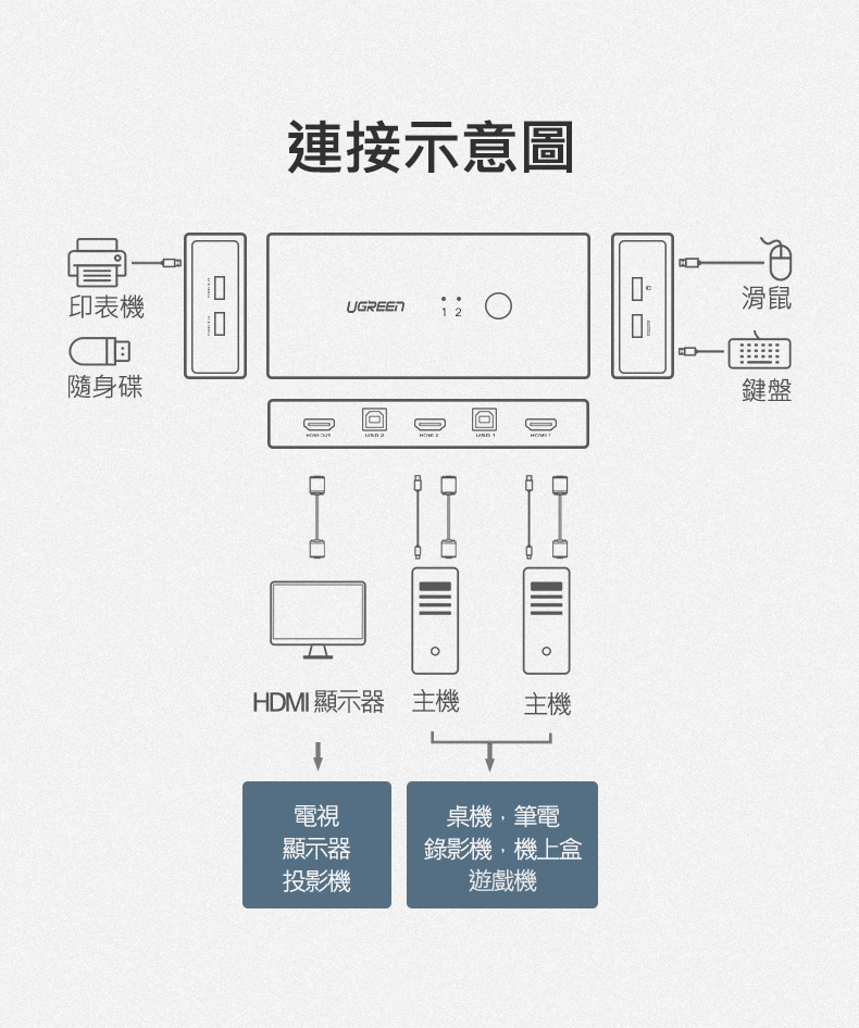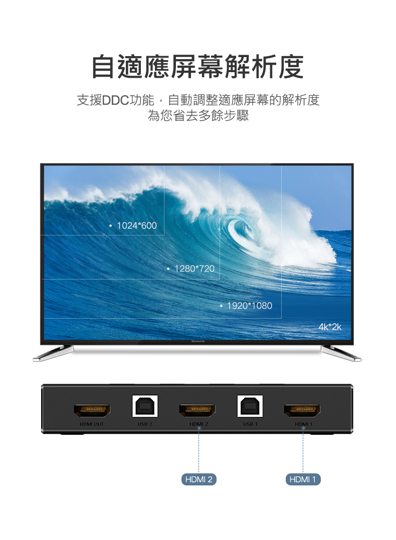 – 可單獨使用HDMI切換或USB切換